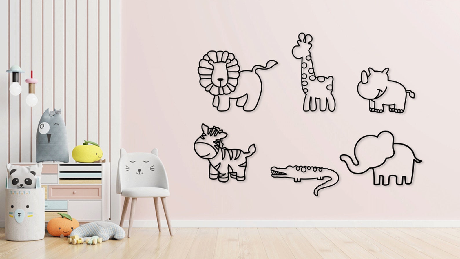 העיצוב כולל מגוון חיות ספארי כמו פיל, אריה, ג'ירפה ותנין, כולם מצויירים בצבעים רכים ונעימים לעין. התמונה עשויה מעץ איכותי, מה שמבטיח עמידות לאורך זמן.