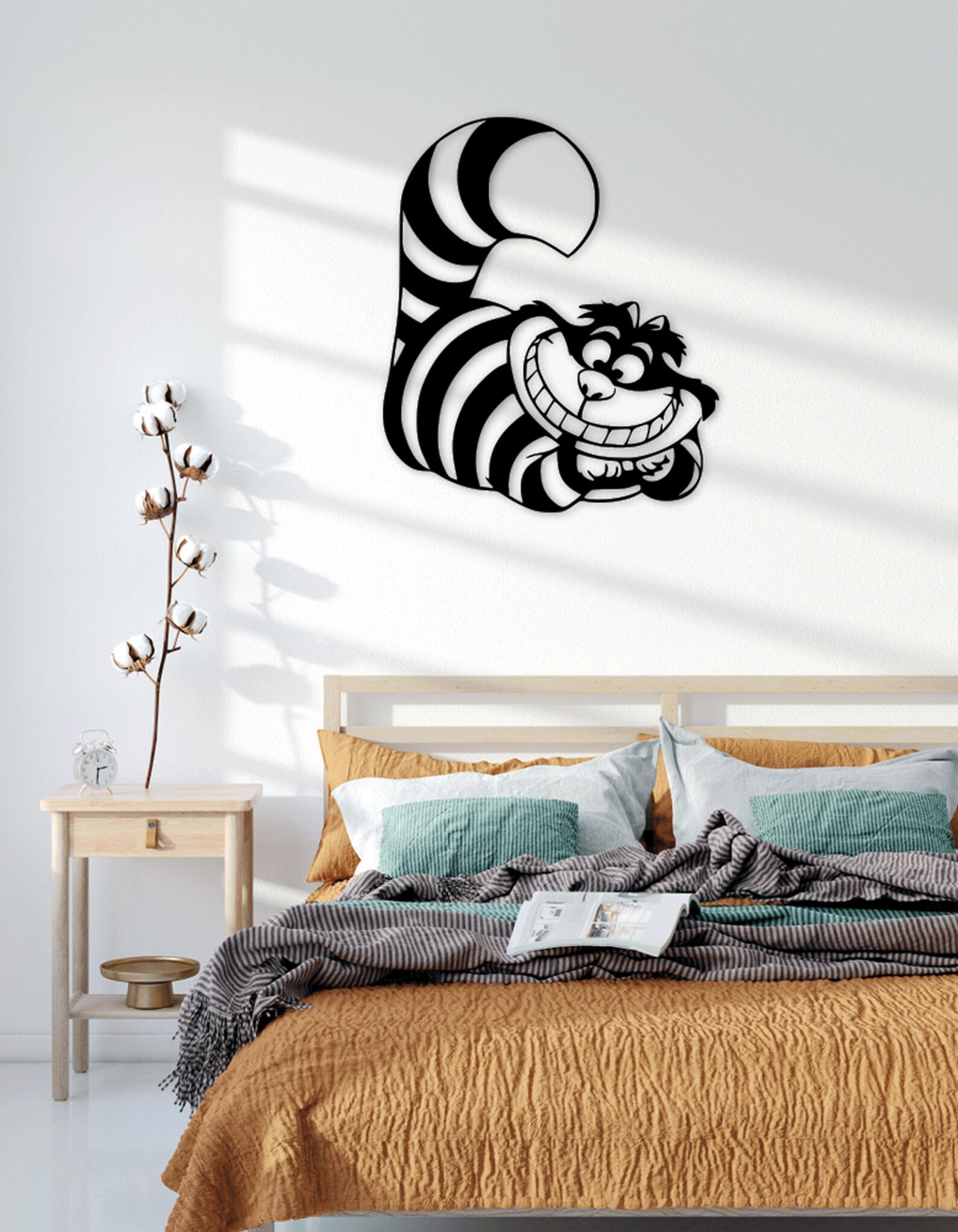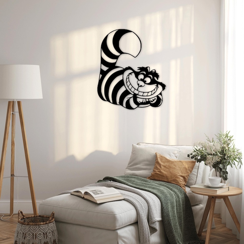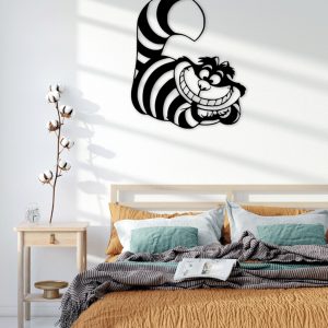 תמונת עץ ייחודית בעיצוב חתול צ'שייר המפורסם מהספר "אליס בארץ הפלאות". התמונה עשויה מעץ איכותי ומעובדת בעבודת יד, מה שמקנה לה מראה טבעי וחמים.